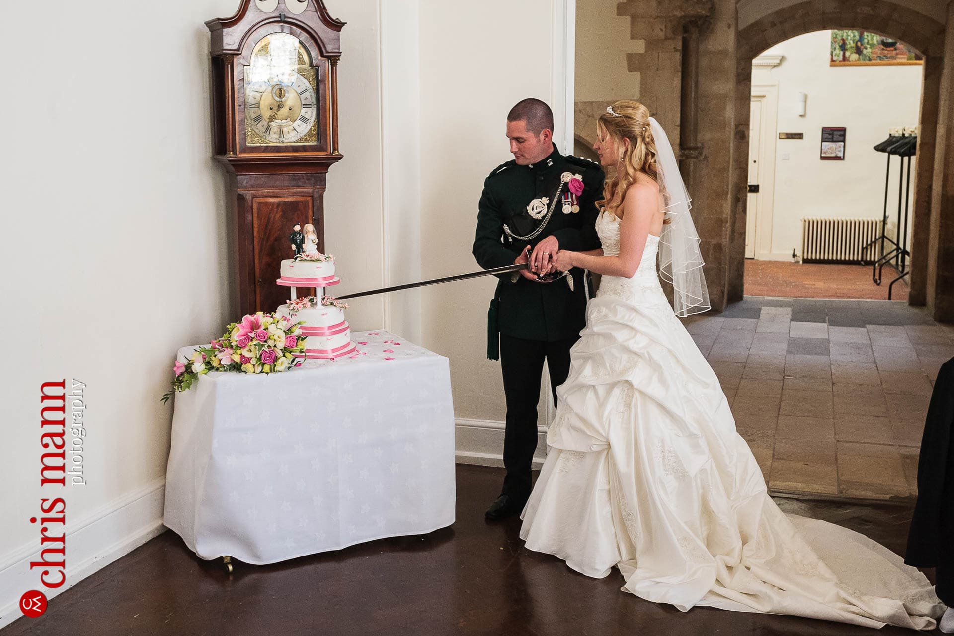 Later on after speeches, Ben and Charlotte cut their cake with Ben’s ceremonial sword. Then we sneaked off with the bride and groom to get some pictures up in the Castle Keep area as the sun was setting on a perfect day.